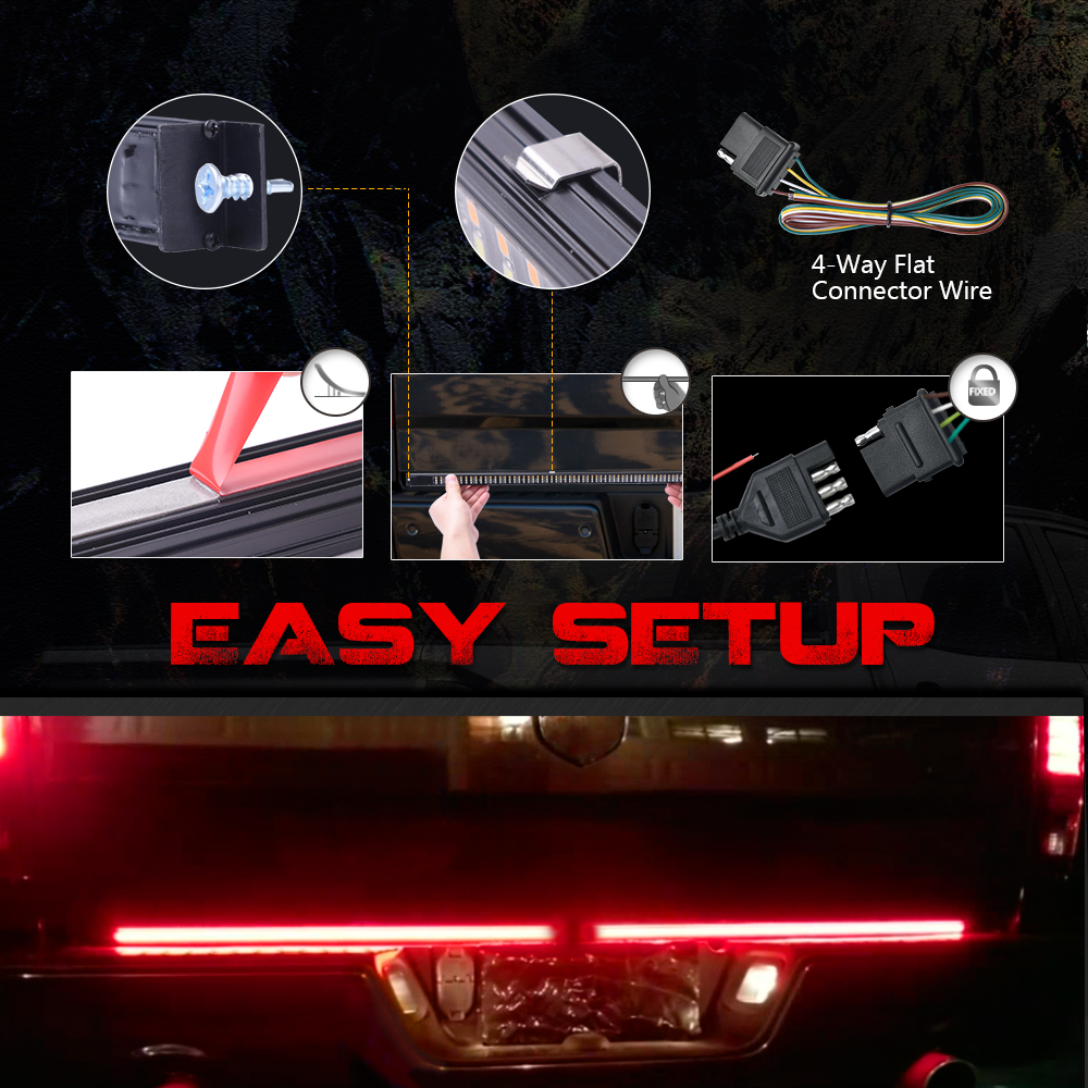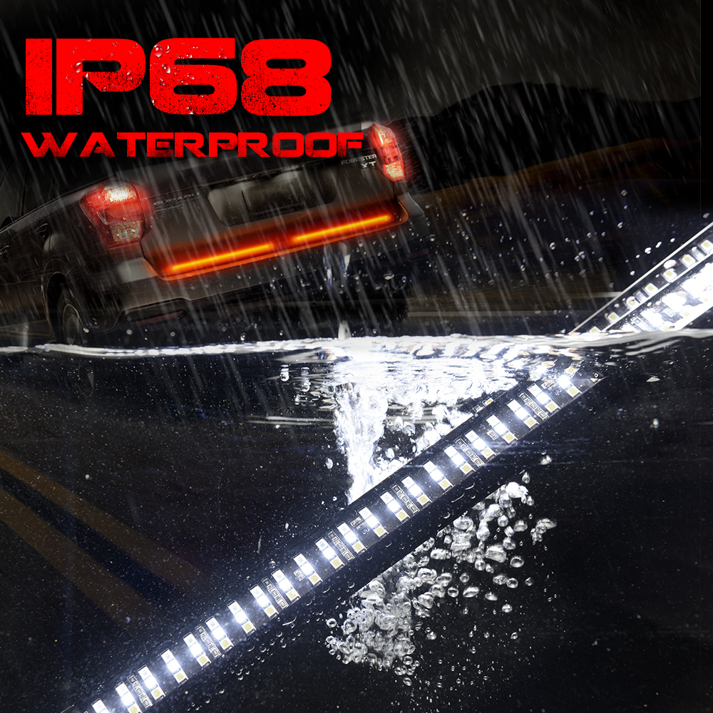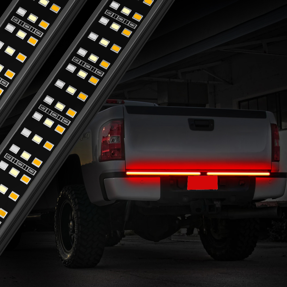 1. MULTIFUNCTIONAL - Features full functions of brake, sequential turn signal, running, reverse and strobe light. The Triple-row tailgate light emits Low Red for running, Bright Red for braking, Amber for left/right turning signals, White for reversing, and Flash Amber for emergency strobe light Let everyone behind you clearly knows what you will do next and avoid traffic accident. The sequential amber turn signals is definitely eye catching and enhance you car look